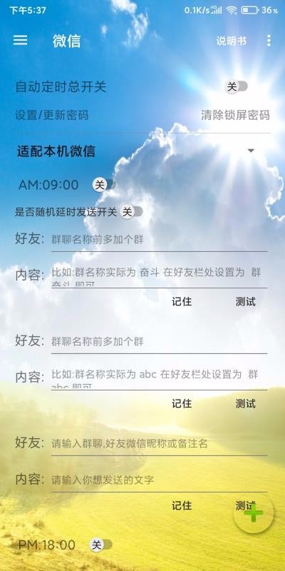 4、设置了许多的微信自动发送设置栏,其中有自动定时总开关、适配机微信以及好友选择与内容编辑等。