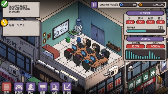 游戏销售:游戏发售之后会有各种宣传和运营的功能,以及大量事件来影响游戏的用户获取和销售情况。我们尝试去模拟整个真实的游戏市场,而不是简单的销售量。每个玩家会有自己的喜好,同类游戏如何特点相同,会产生竞争,品质低的游戏销量会大大被影响。玩家需要根据市场实际情况来决定公司的发展路线,比如当大逃杀游戏成为热点的时候,市场上很多大公司会同时去开发这类游戏,在自身实力不足的情况下盲目去做大逃杀,反而会因为游戏品质不如大厂的同类游戏而扑街。