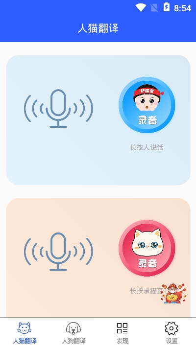 可以和喵星人进行对话沟通,按住说话,将会把您要讲述的内容,通过喵星人能听懂的语音讲述,猫咪的叫声,也可以通过软件进行翻译。