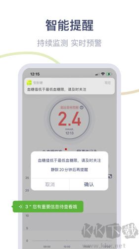 4. 当血糖值异常时系统将自动弹出提醒窗口,并支持延后提醒与事件记录操作。