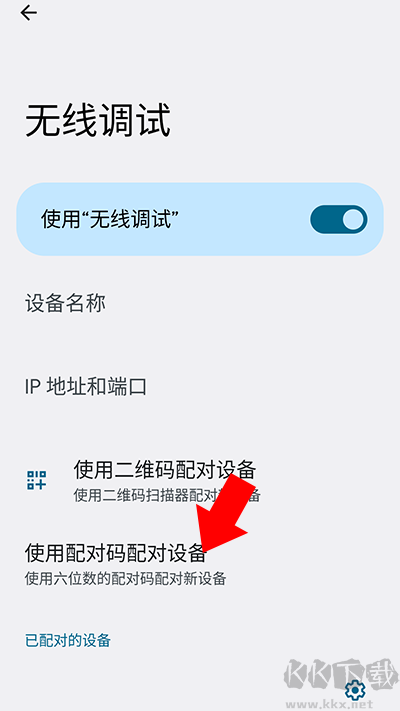 5、点按“无线调试”中的“使用配对码配对设备”,然后我们记住六位数的配对码