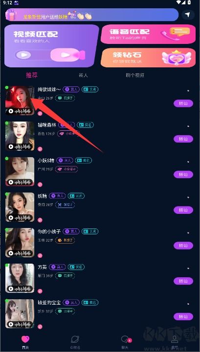 3、进入首页界面可浏览系统推荐的用户列表,选择心仪的用户点击头像进入查看。