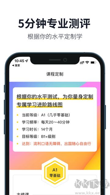1、用户首次打开APP即进入5分钟英语水平测评,系统将依据测试结果量身定制学习计划,即便是零基础用户也能稳步入门、轻松跟学。