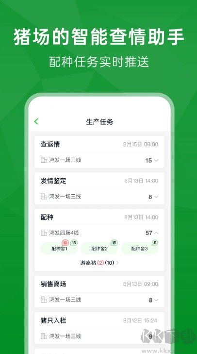 1、任务智能推送:基于生猪生长周期自动生成生产任务(发情监测、配种、返情检查、妊娠诊断、分娩看护、断奶管理、免疫接种等),工作人员每日清晰掌握工作内容,实时记录数据,确保任务不漏、数据准确。