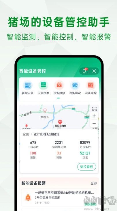 4、设备状态查看:猪舍列表新增显示全场设备总数与异常数量。