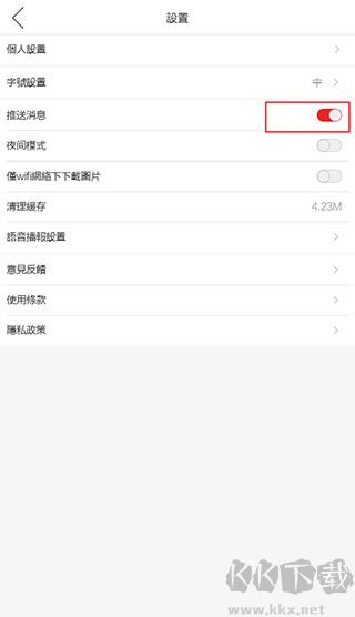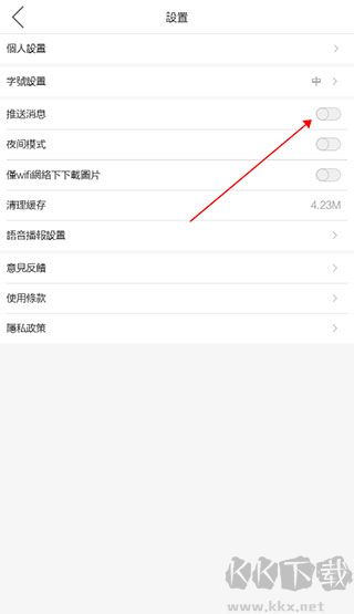3、在参数设置列表中找到“推送消息”栏目,点击右侧的圆形开关。