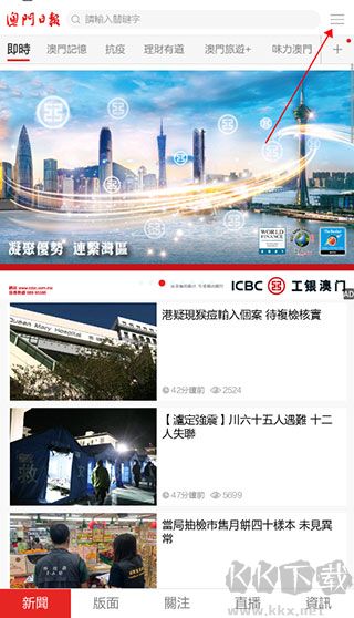 1、启动安装完毕的“澳门日报”应用,在首页右上方找到“三”形状图标,轻触后进入个人中心。