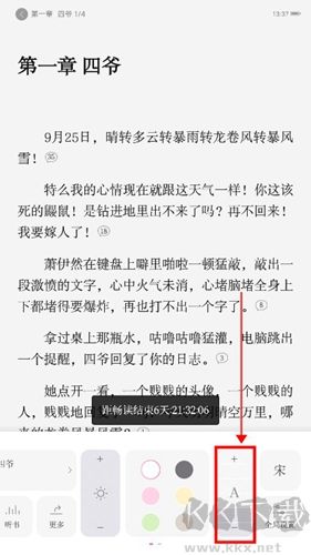 2、在小说的阅读界面,我们轻击屏幕,就会弹出小说阅读的设置界面,在这个界面我们点击下方的一个【A】符号的【+】和【-】,就可以随意调整字体大小了。
