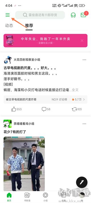 2、关注其他用户(豆友)之后,“动态”将实时展示他们分享的生活点滴和思想火花;关注感兴趣的主题内容源,则能获取该主题下的最新资讯。“推荐”页面精心挑选个性化内容供你探索,帮助你发现更多志趣相投的朋友,并建立联系。