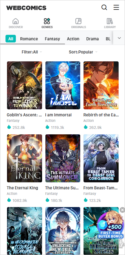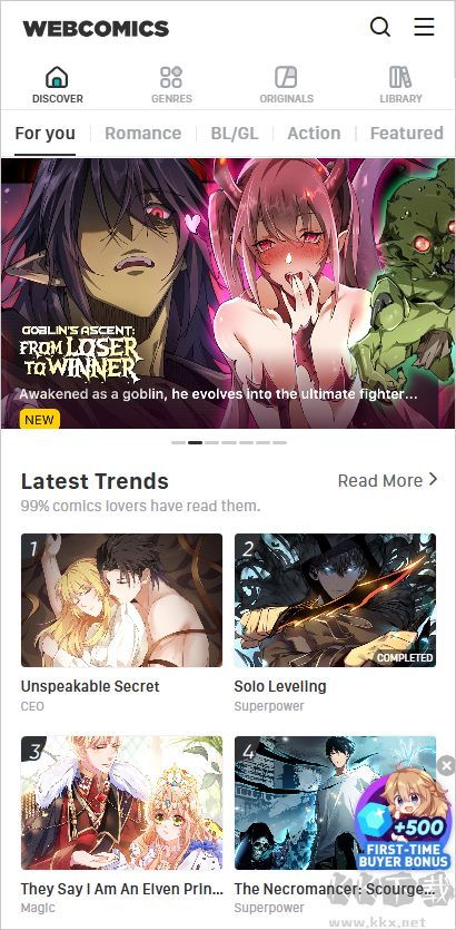 1、WebComics汇聚全球正版漫画资源,题材丰富多元,涵盖热血、奇幻、爱情、BL/GL、搞笑、校园、恐怖等类型,精准契合各类读者的阅读喜好。无论你想重温经典还是追更新作,都能在此轻松找到并持续跟进。
