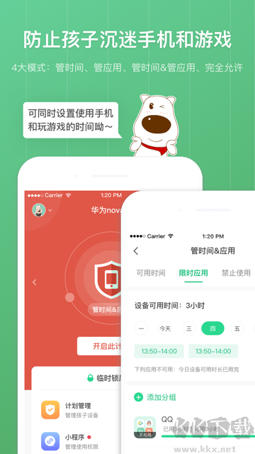 对儿童移动设备应用进行管理,可完全禁用程序,也可为各应用单独设定允许运行的时间区段与时长。