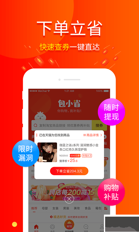 1、购物更省钱——领券购物后还可获得补贴,提现方便,到账迅速;