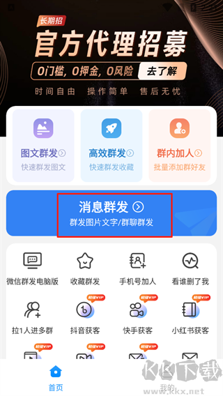 一键群发app是一款现代营销需求的智能软件,拥有人脉拓展、客户管理与高效营销功能于一体。支持全自动化一键操作,轻松实现跨平台智能群发,覆盖微信、短信等多渠道消息批量发送,还能根据好友昵称自动生成个性化内容,让节日祝福和营销推广更显诚意。软件配备短视频获客功能,打通抖音、快手、小红书等主流平台,通过关键词智能筛选潜在客户,一键发送定制化消息,彻底革新传统拓客模式,快速高效触达目标人群,让营销更精准、更省心。需要的朋友快来下载试试吧!