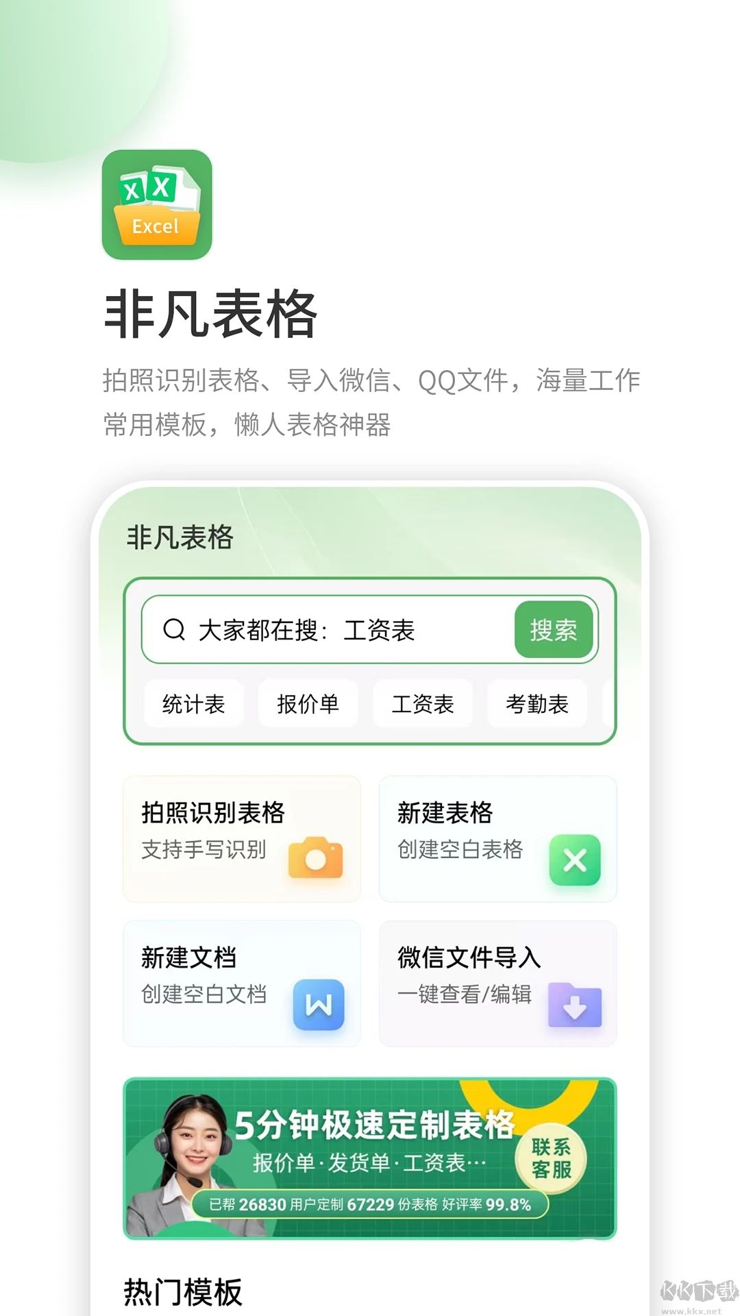 非凡表格App是一款方便高效的手机办公工具,不仅能够满足你制作工资表、考勤表、报价单等多种表格需求,它还能够提供上万种持续更新的Excel模板,让你在手机上就能轻松创建、查看、编辑和分享表格。软件还支持导入现有文件、使用基本公式与常用函数,并能通过扫描文件区域快速生成表格内容,自动调节行列尺寸、查看多工作表页等功能一应俱全,是移动办公的实用帮手。