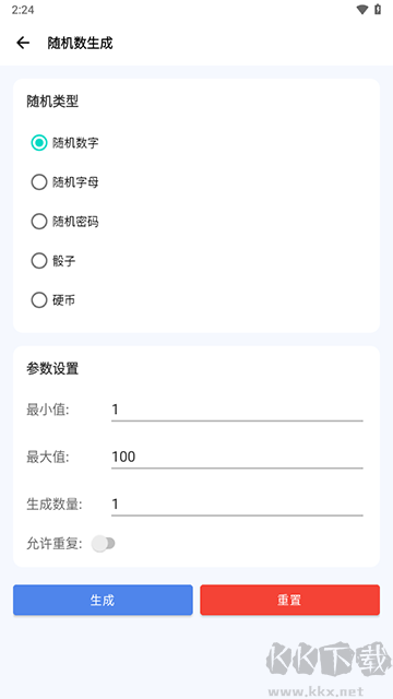 支持随机数字、字母、密码生成,模拟骰子/硬币投掷,可自定义参数。