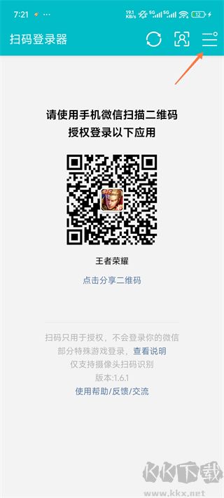 1、打开游戏扫码登录器App,点击右上角的【三】