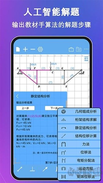 3.搭载独创智能模块,依托人工智能算法,可输出结构力学教材中各类方法(桁架截面法、位移法、力法、几何构造分析等)的完整解题步骤。