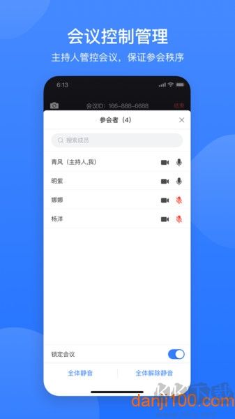 2、主持人会管会控:主持人可一键全体静音、移出参会者、锁定会议等,有效维持会议秩序;