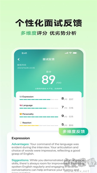 2.智能分析精准赋能提升:每完成一次模拟面试,系统都会生成详尽的分析报告,清晰标注个人强项与待改进之处,针对性指明提升方向,帮助精准优化面试技巧。