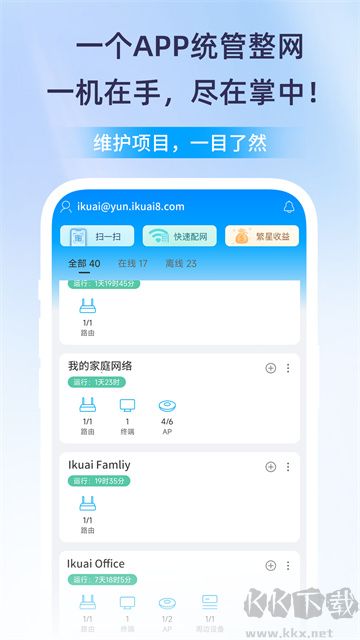 爱快e云app是一款以WIFI分析,网络部署等功能为主的移动应用,集合多项实用组件,包括信号探测、网络诊断、速率评估、无缝切换查验、频段检查、点位核验、供电估算与规划设计,辅助完成各类无线项目交付、检验、调优及移动维保,使用者能直接维护与调整所属网络,对工程师或日常用户而言,程序便捷高效,让网络运维工作更简单。