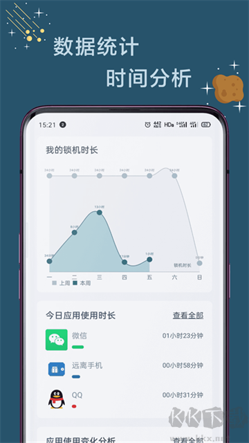 3、数据记录:能够查阅当天、当月以及全部的专注累积时长,系统同时提供本周与上周的对比走势图,清晰展现节省的时间。