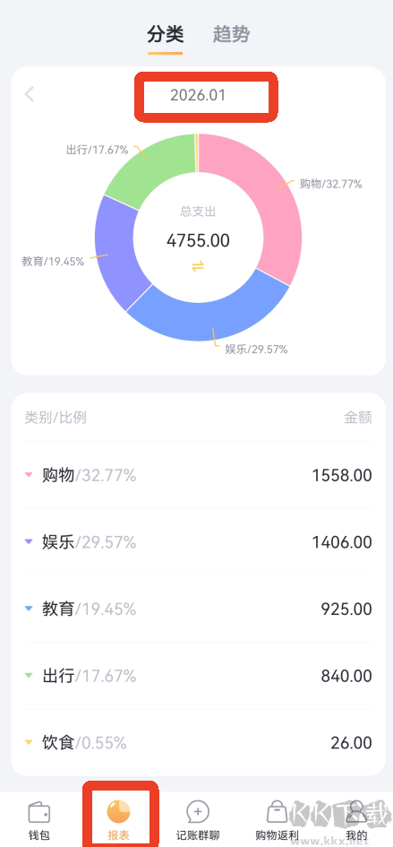 1、进入软件后点击下方【报表】,只能看到你本月的总消费。