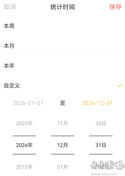 3、滑动选择全年范围,先设置开始时间,然后再点击结束时间开始设置,完成后点击右上方的【保存】。这里以2026.1.1-2026.12.31为例。