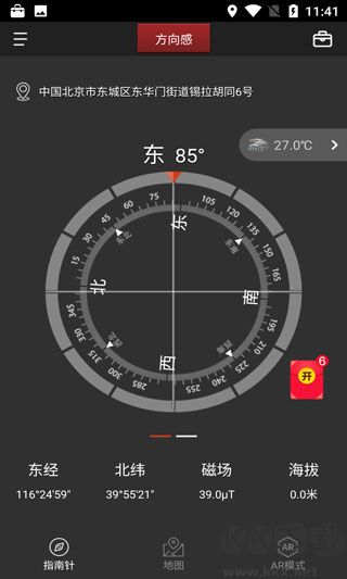 3、点击左下角“指南针”,现在你可以看到你所处位置的经纬度、磁场、海拔、天气等;