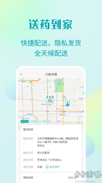 4、支持货到付款,并且拥有自建配送团队“药士达”(目前服务范围限于北京望京区域),让你在家就能方便购药。
