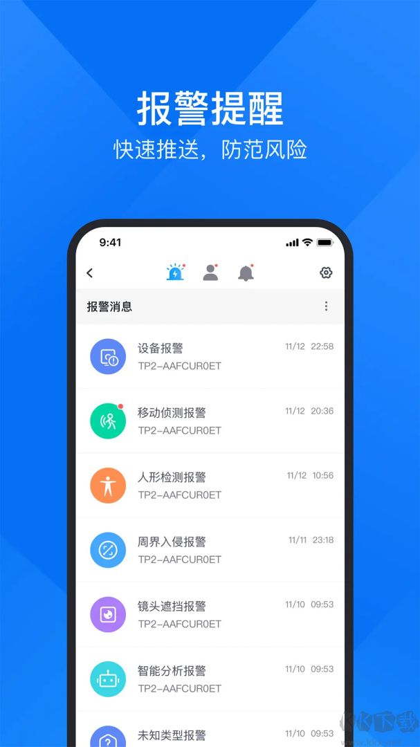 3、报警管理:支持门磁、手环、遥控、烟感、幕帘、红外、燃气泄漏、移动检测等多种报警类型;