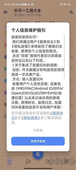 1、首先从官方网站获取程序,安装到移动设备后启动,点选同意并继续选项。