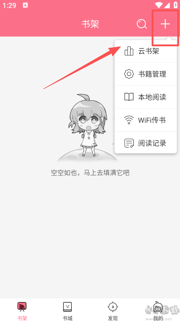 1、在书架页面,点击右上角 “+” 号,可选择云书架、书籍管理等功能进行操作。