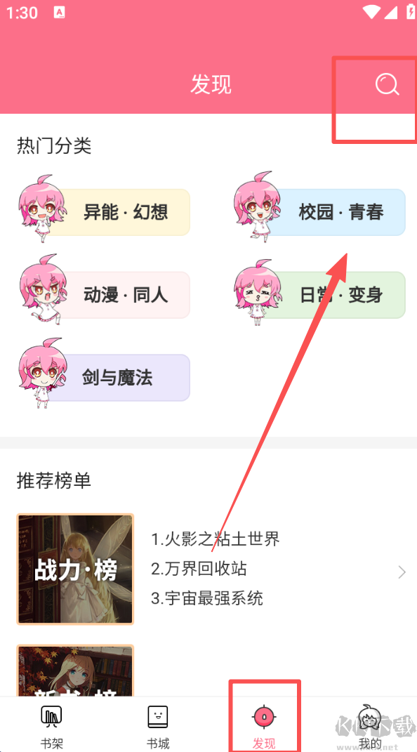 3、进入发现页面,点击右上角搜索图标,可按分类或榜单查找感兴趣的书籍。
