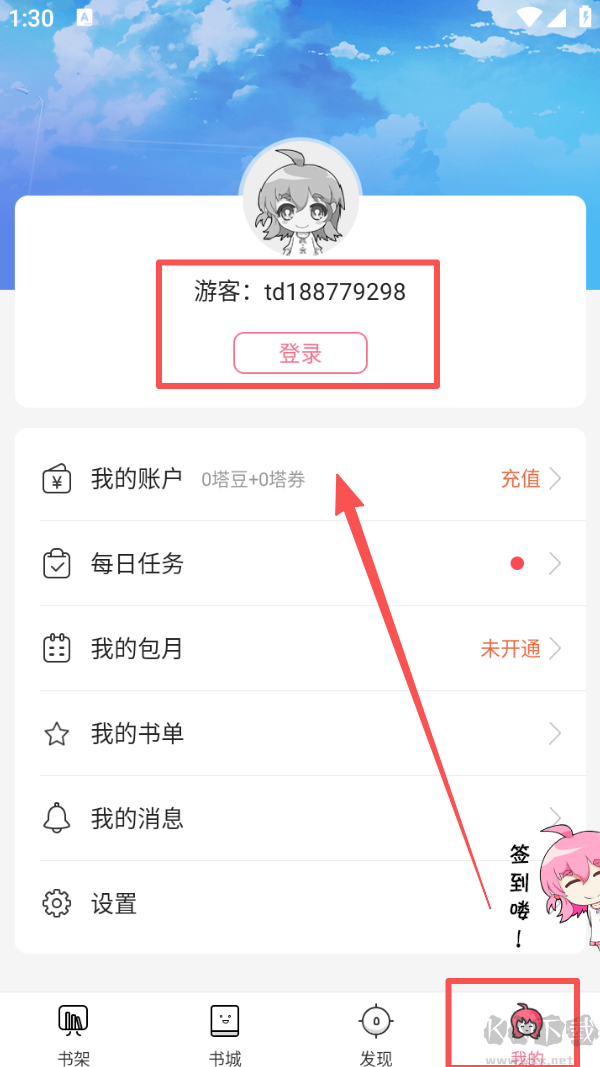4、打开 “我的” 页面,点击 “登录”,登录后可查看账户、任务等个人相关信息。