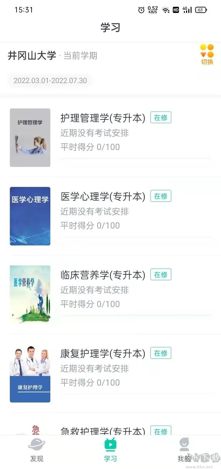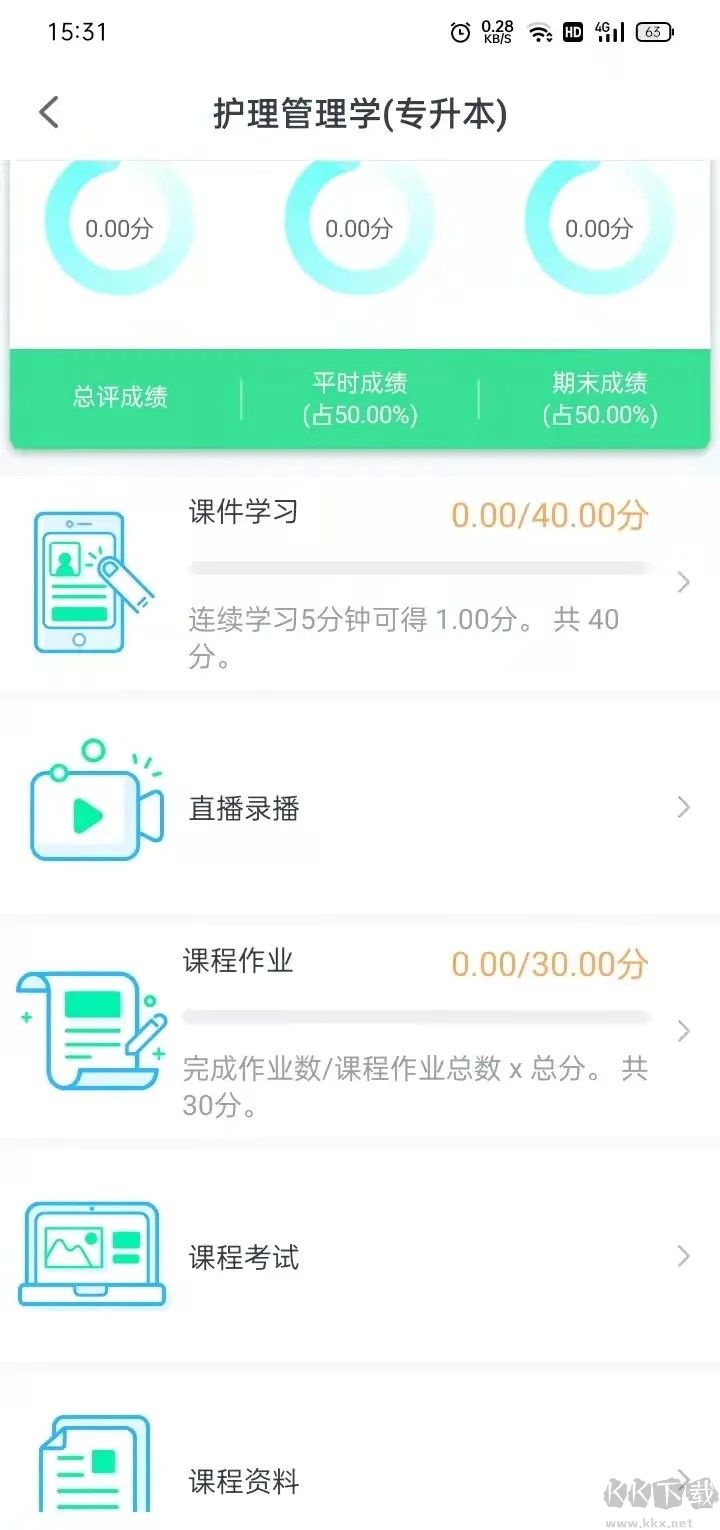 2、登录后,点击“学习”可查看到自己当前学期需要学习的课程,点击开对应的课程,可以进入课程,点开“课件学习”,可以听课,每门课程至少听满120分钟,听课时间可以累积。课件学习有分数进度条,进度满了,此项任务已完成!