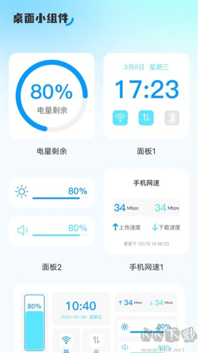 设有多种方便桌面小工具,帮助迅速浏览重要内容。包含电池状态、移动网络速率、屏幕明暗与声音大小调节。