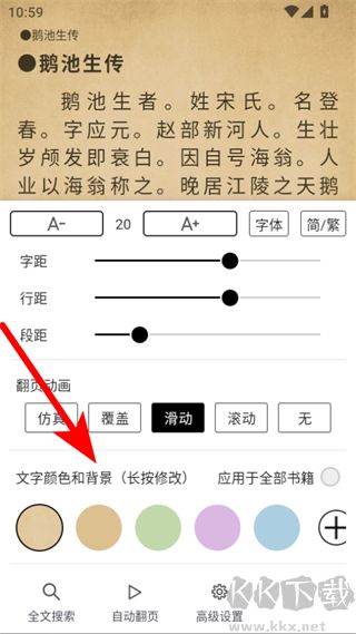 3、在阅读设置页面,可设置字距、行距、段距、翻页动画等,还可长按文字颜色和背景区域选择喜欢的背景颜色。