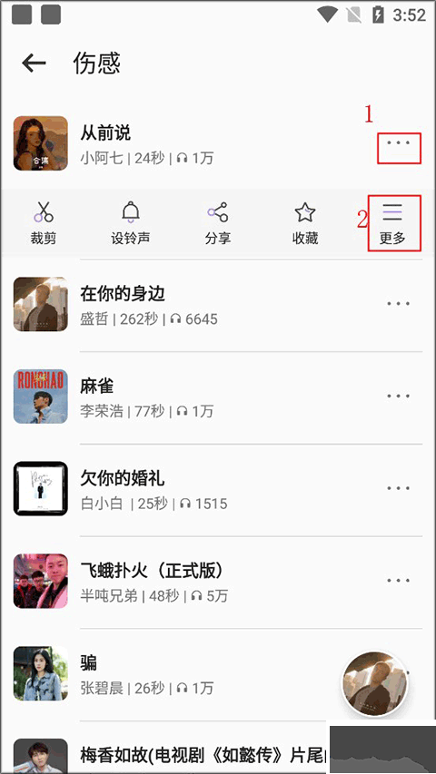 我们先在铃声界面找到我们需要下载的,先点击歌曲后面的3个点,再在弹出的列表中点击更多。