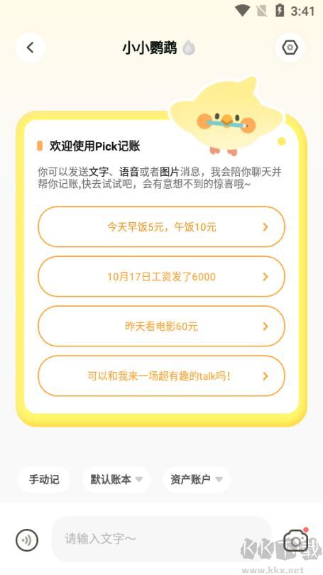 1、首次启动Pick记账,用户可与活泼的“小鹦鹉助手”对话互动,开始专属记账旅程;