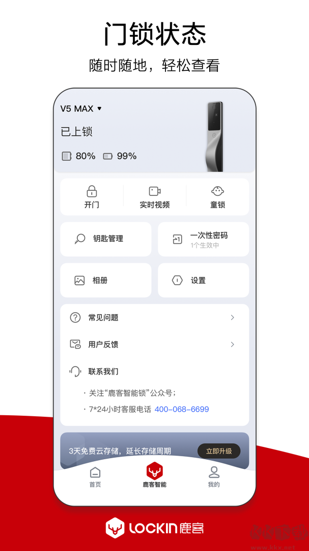 鹿客管家app是一款专为智能门锁设计的控制管理应用,让您通过手机便捷守护家庭安全。它不仅支持远程开锁与上锁,还可随时查看门锁使用记录,帮助您及时了解进出情况。应用内置高清摄像头功能,助力防范异常访问,为家居安全提供多重保障。您可以灵活设置临时密码、指纹或门卡权限,方便家人、亲友临时出入,也可为保洁、维修等人员提供限时授权。鹿客管家将智能科技融入日常生活,在提升便捷性的同时强化安防体验,让家居管理更加省心可靠。