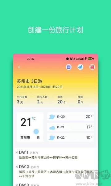 5、功能贴心全面:内置导航、行程提醒、天气查询、旅行清单、记账等实用功能,简约设计不繁琐,兼顾便捷性与实用性。