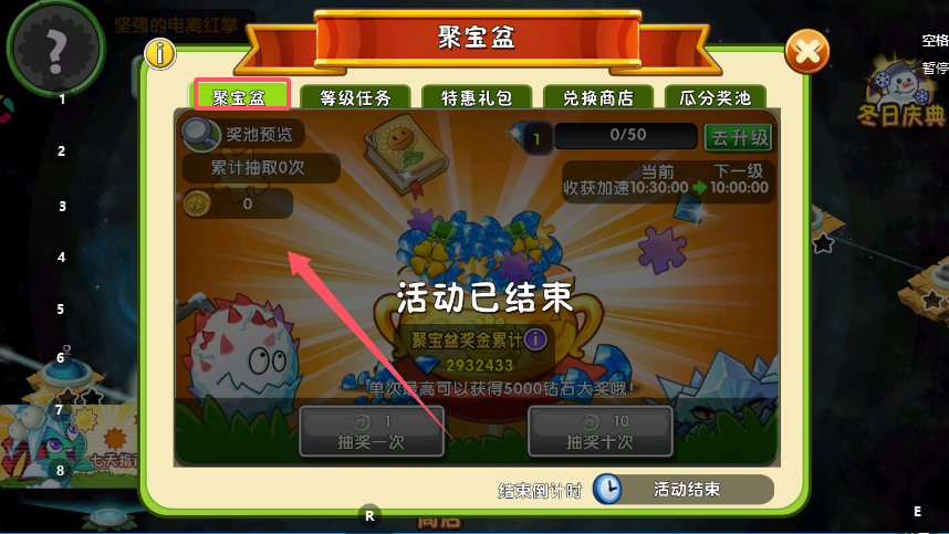 2、在聚宝盆主页面,选择单次或十次抽奖,每次抽奖都会累计次数,这些次数是提升瓜分奖池排名的关键,同时聚宝盆等级可通过成长值升级,等级提升后奖励收获速度加快。