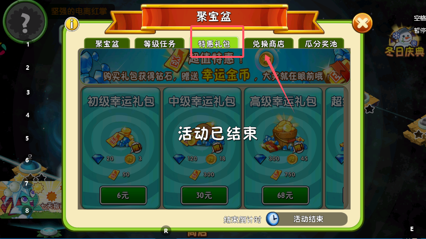 4、在特惠礼包处购买不同价位的礼包,获取钻石与幸运金币,再到兑换商店用幸运金币兑换植物进阶书、金币等道具,兑换时需注意各道具的消耗数量与限购次数。