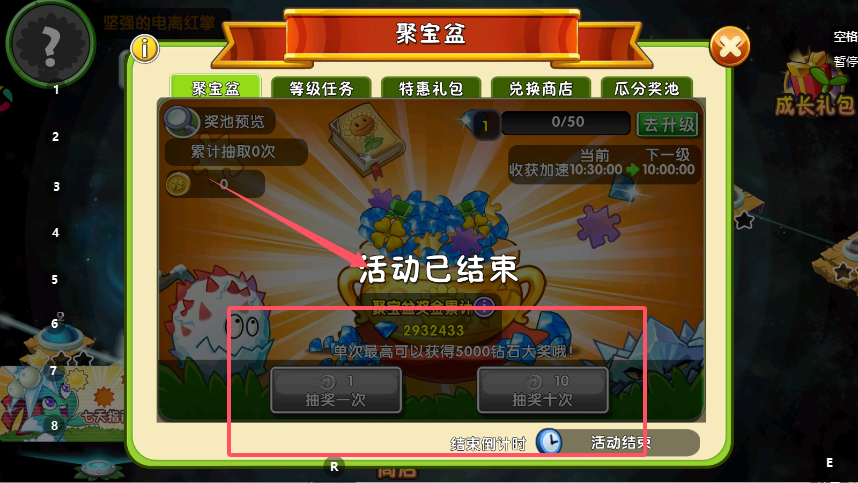 2、在聚宝盆抽奖界面,点击“抽奖一次”或“抽奖十次”积累次数,这些次数会直接关联瓜分奖池的排名,同时抽奖过程中可能触发单次最高5000钻石的大奖,奖池累计金额会持续更新。