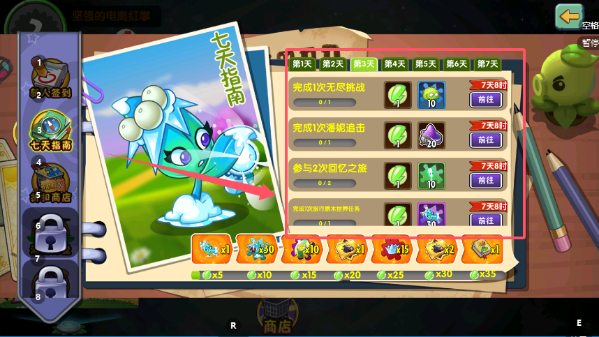 4、活动说明明确提示“一代强力植物前来助战登录7天即可拥有”,通过连续七日登录的简单操作,新玩家就能获得寒冰射手这款经典控场植物,有效提升前期关卡的通关效率。
