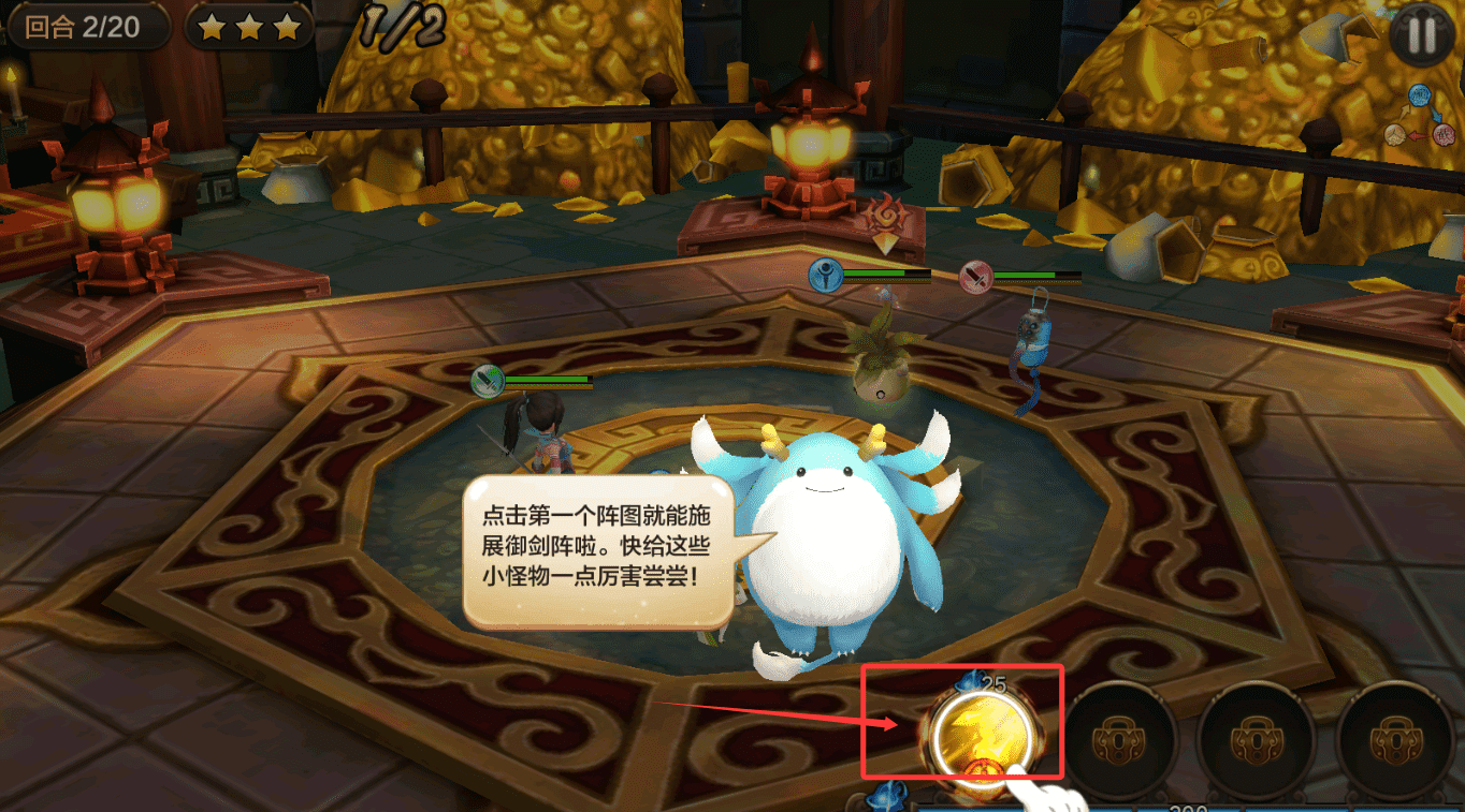 4、在战斗环节中,界面会显示当前回合进度。根据提示点击阵图即可发动特定技能,例如施展御剑阵对敌人进行有效打击,从而顺利推进关卡并体验策略战斗的乐趣。