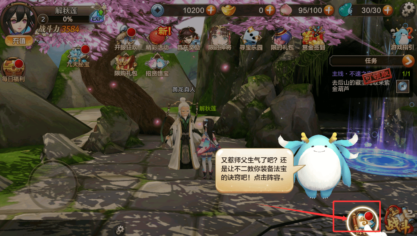 4、遇到战斗时,界面上会显示当前回合信息,并给出操作提示,比如点击阵图施展森罗阵来提升防御。平时也可以点击阵容界面,学习如何给角色装备和搭配法宝。
