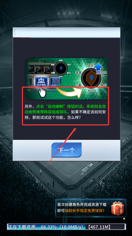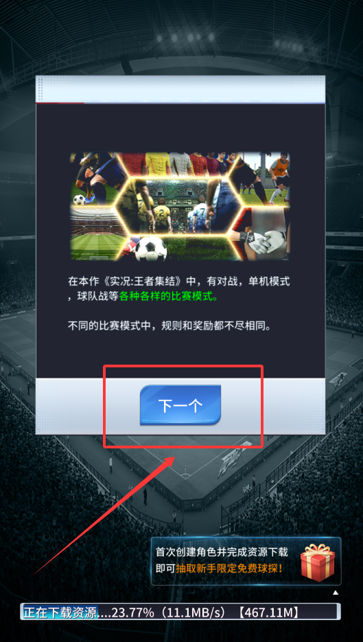 3、建议先领取新手福利,首次创建角色并完成资源下载,就可以抽取新手限定的免费球探,这是获得强力球员的好机会呀。