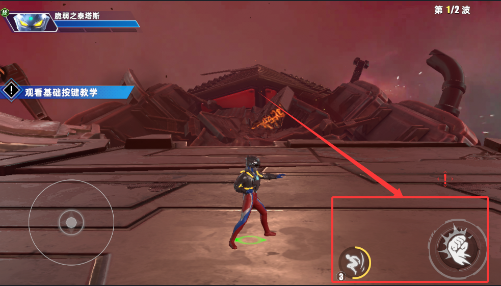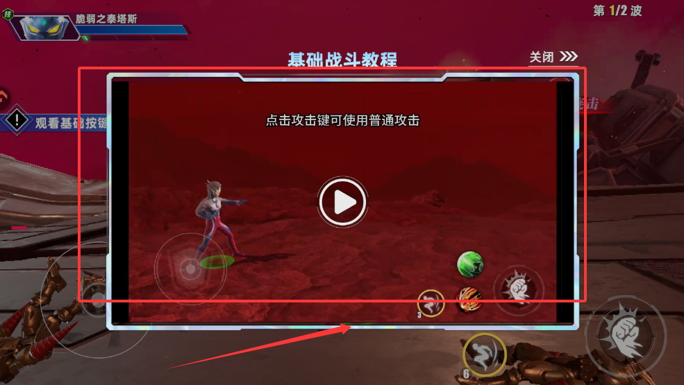 2、按照提示点击攻击键来熟悉普通攻击操作,过程中会分波次逐步引导直到完成全部教学。