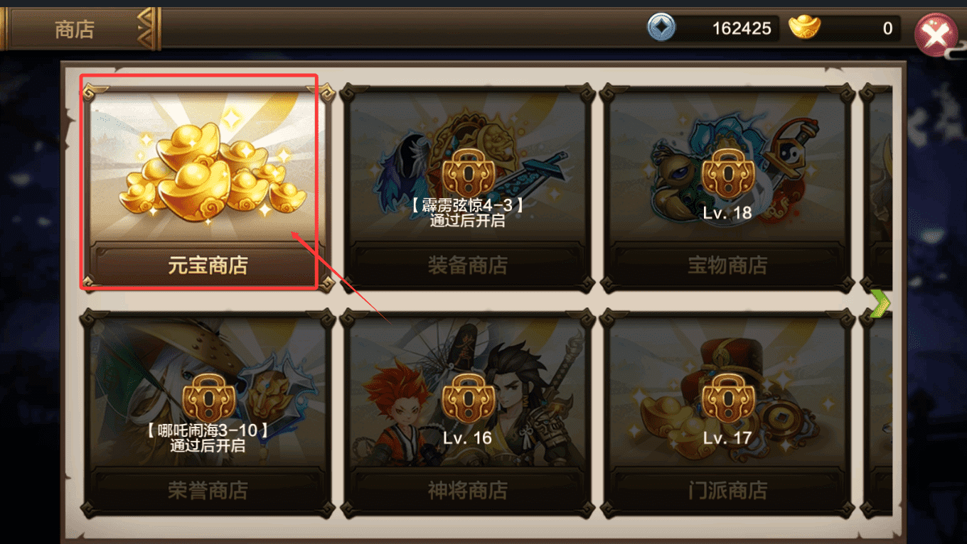 3、各类商店系统需要达成特定条件方可解锁,例如“宝物商店”需通关露露孩侬4-3。商店内使用不同货币可兑换神将、装备等珍贵道具,是提升战力的重要补充渠道。